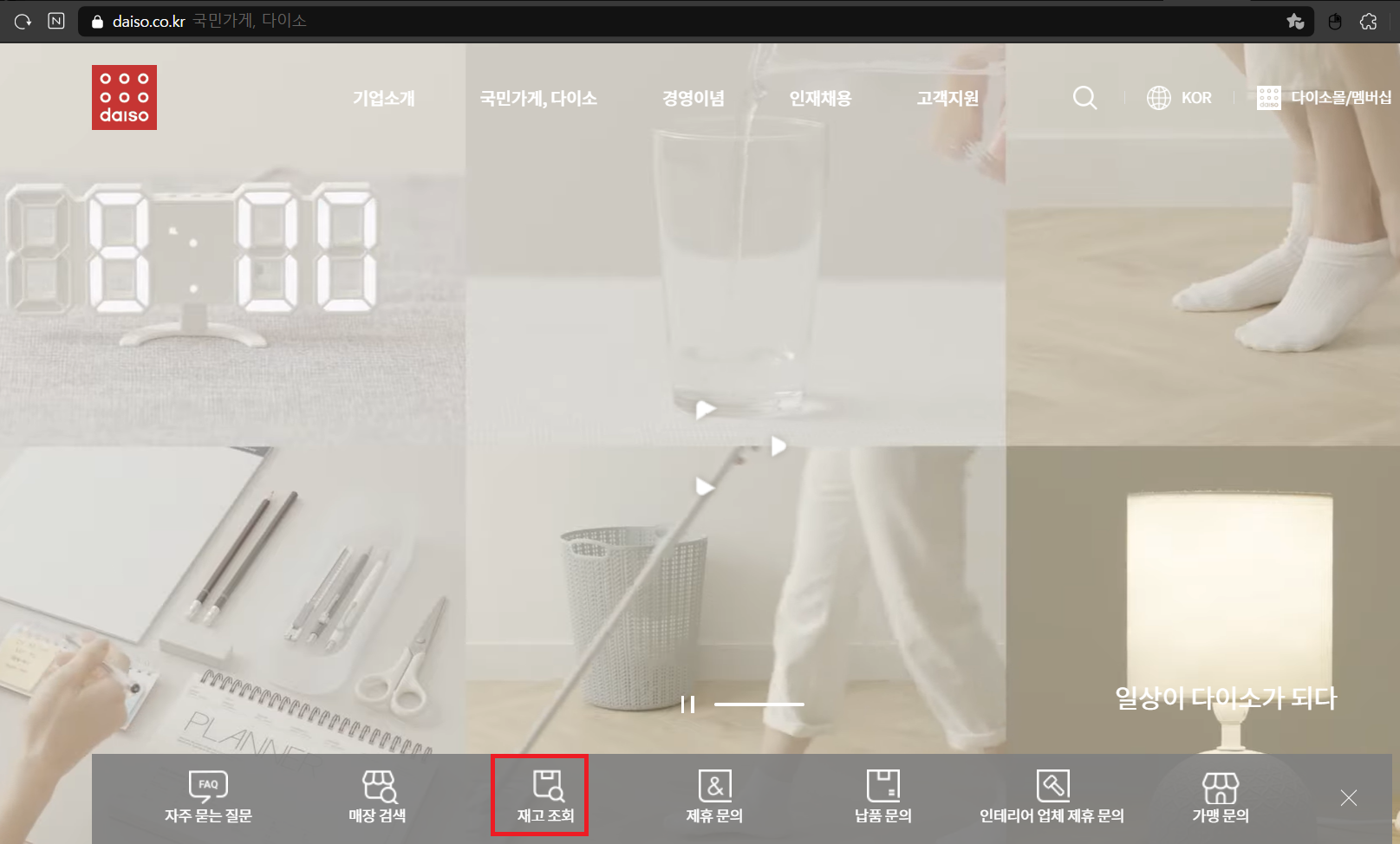 다이소 홈페이지(https://daiso.co.kr/)에 접속 후, 하단 메뉴에서 '재고 조회'를 클릭합니다.