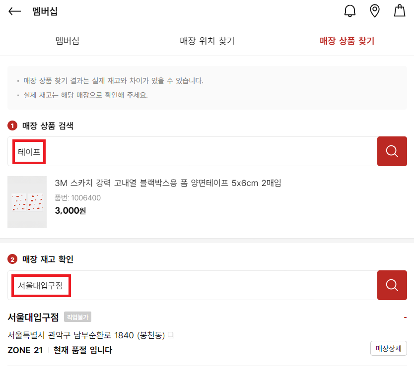 3. '상품' 및 '매장 위치'를 검색합니다.