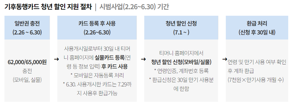 2월 26일부터 6월 30일까지는 기존 가격으로 이용하고, 7월에 환급 신청해서 할인받은 금액을 돌려받을 수 있어. 모바일카드든 실물카드든 꼭 등록하고, 환급 신청 잊지 말고 해야 해.